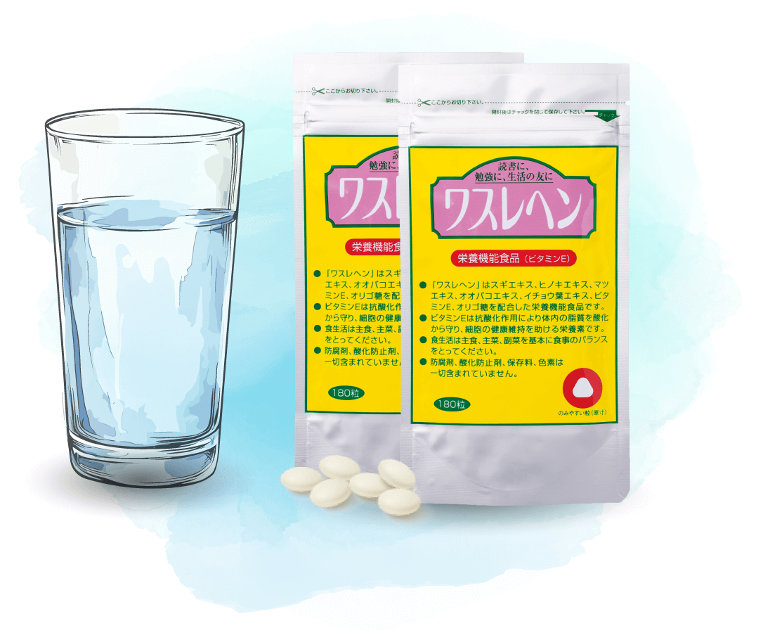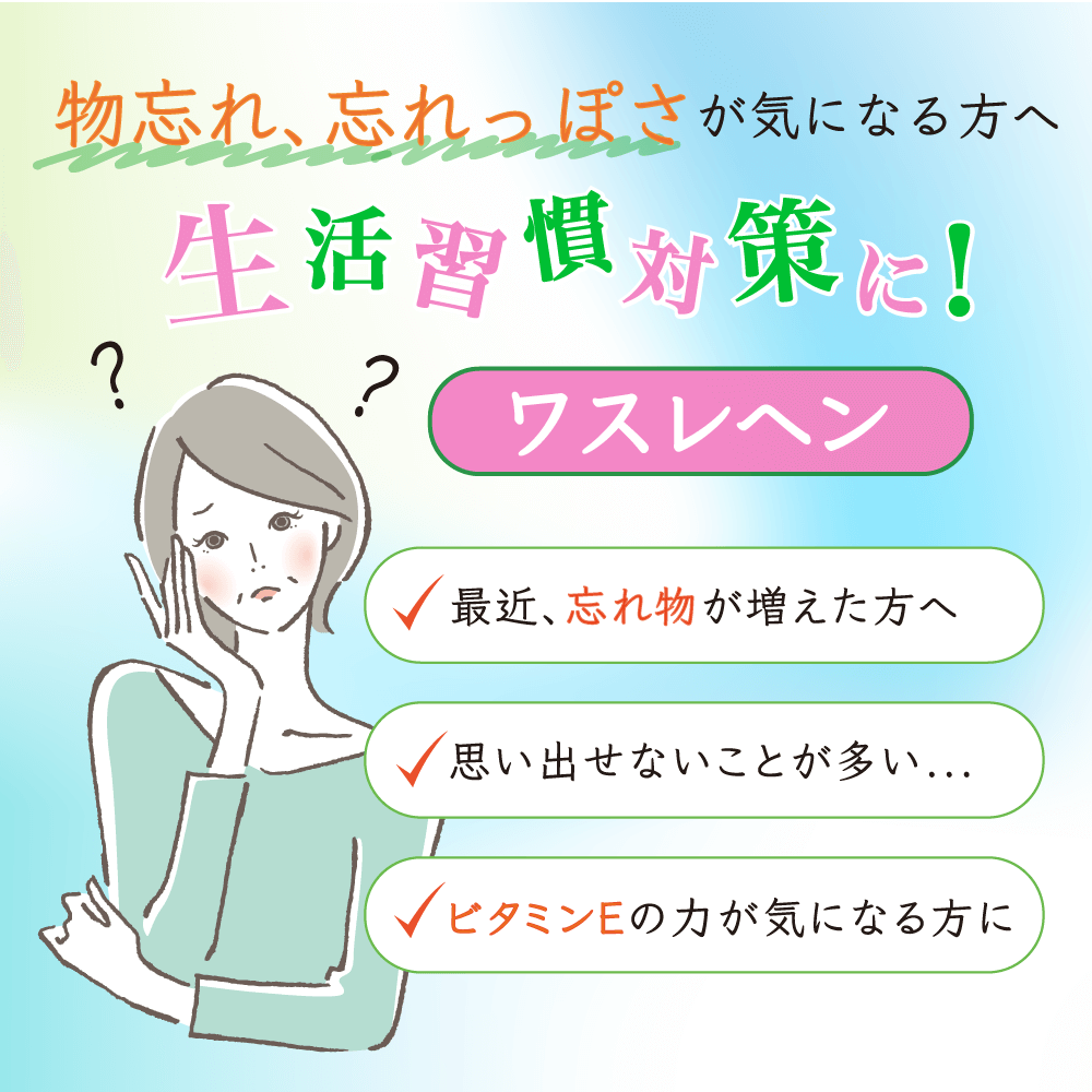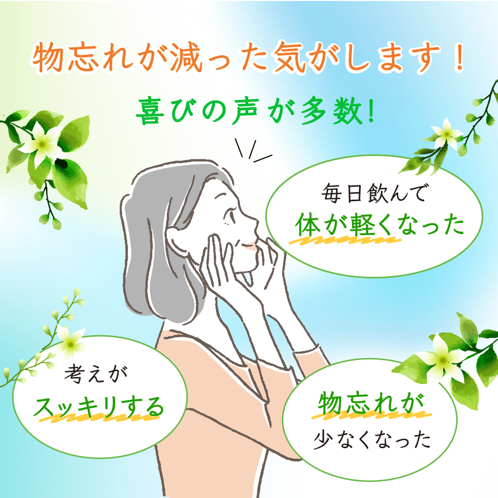 友達や物の名前を忘れ、なかなか思い出せないことが多かったです。 何か良くなる方法がないか? といつも心にひっかかっていました。そんな時に栄養機能食品 ワスレヘン に出合い、早速飲み続けました。 それまでは思い出せないことが、しばしばありましたが、何かワスレヘンで記憶力が良くなって来ているように感じています。 これからもワスレヘンを続けて飲み、少しでも記憶力が良くなるように頑張っていきたいと思います。