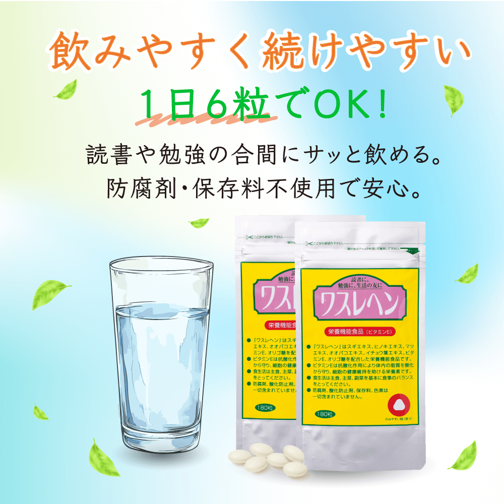 「ワスレヘン」を注文しましたが、最初は、ほんまかいな?と言う気持ちでした。しかし、ワスレヘンを飲み続けると、ことのほか不思議なくらいに記憶が冴えて、呑むと呑まないとで差がある事に気がつきました。娘が衛生管理の国家試験を取る為にワスレヘンを娘に勧めてみましたら、ワスレヘンを飲み続けたおかげで、娘は一発で合格しました。私も認知症の予防の為にワスレヘンを続けて行こうと思っております。ワスレヘンて、なんかおもろい名前やなあ。