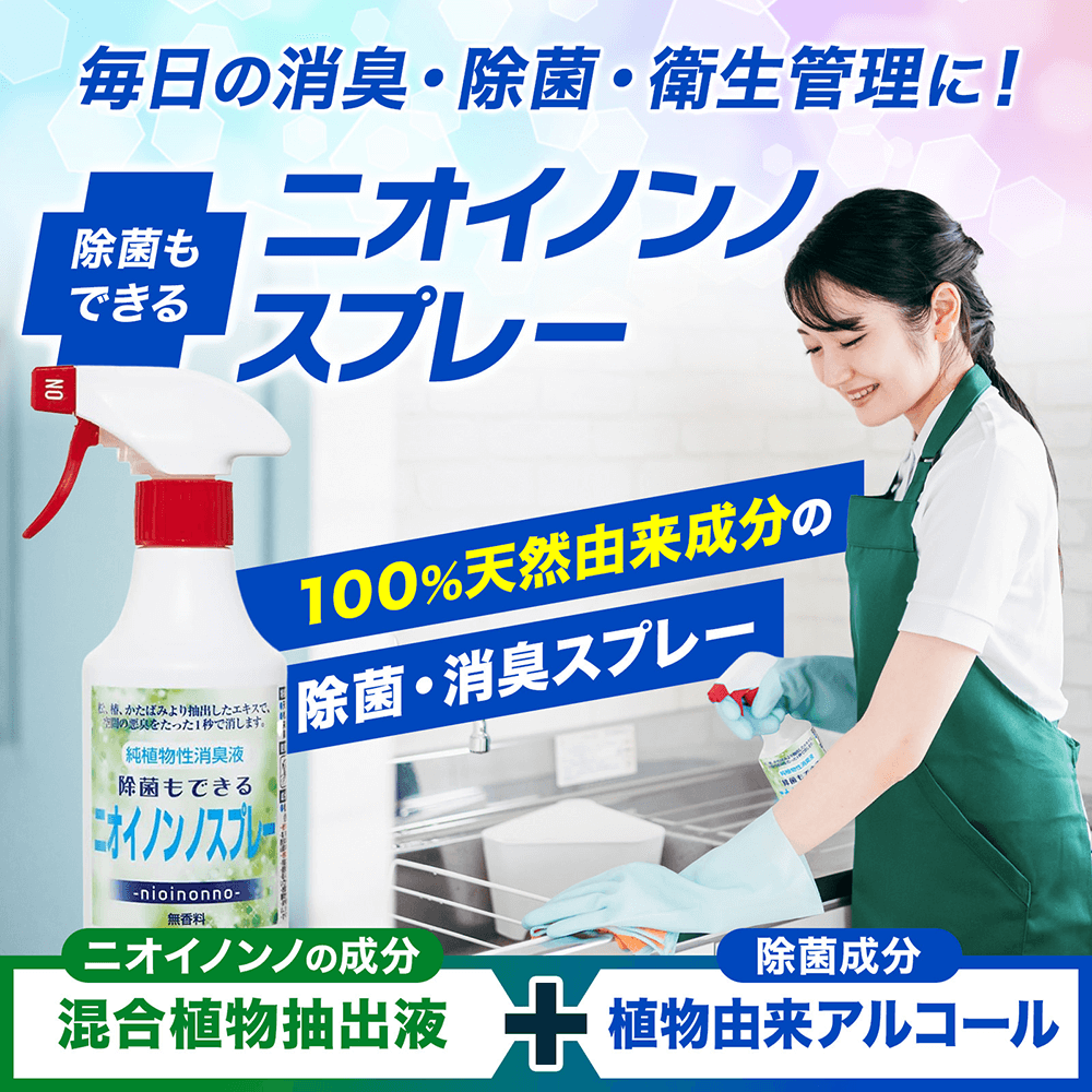 除菌もできるニオイノンノスプレーは植物由来のアルコール成分を配合しているため、使用後はサッと乾いてべたつきが残りません。