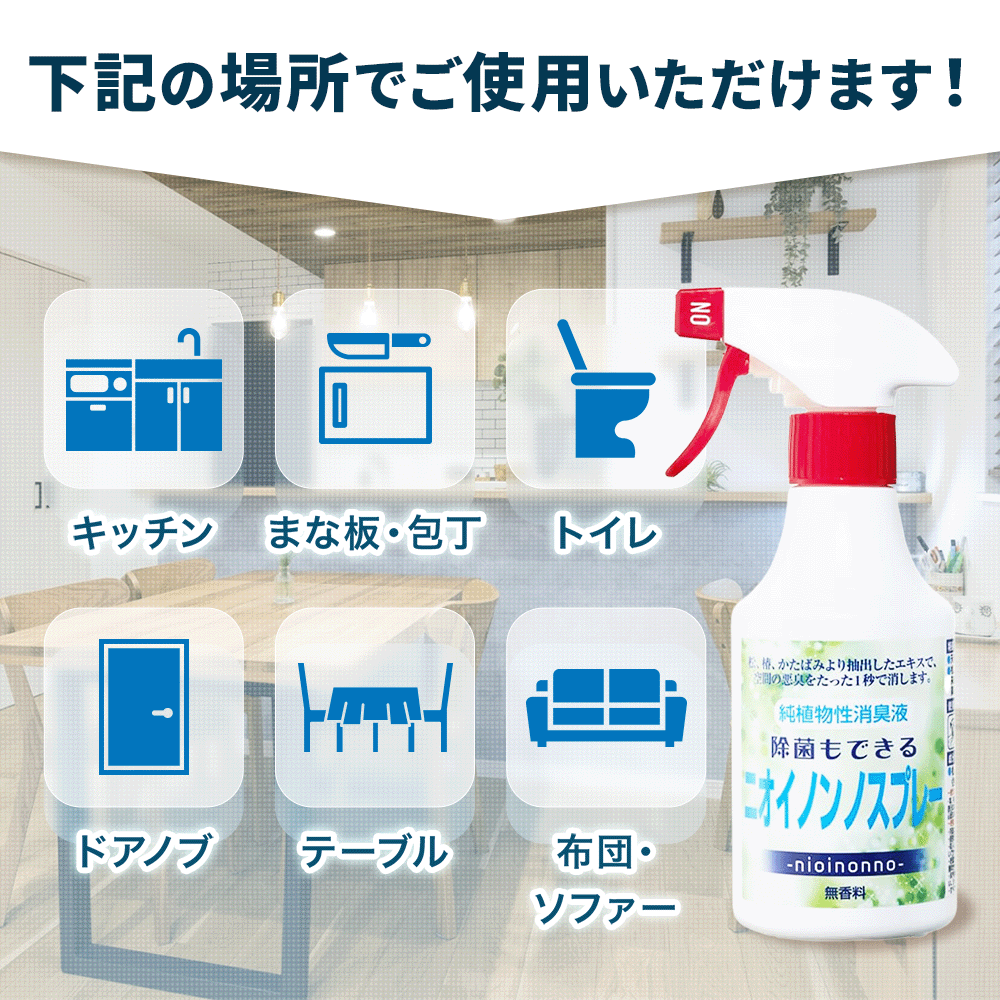 ニオイノンノの成分である松、椿、カタバミから抽出した100%天然植物エキスをベースに、植物由来アルコールを配合。これ1本で除菌から消臭までできるスプレーです。石油系の成分は一切含まず、安心・安全の植物成分でできております。