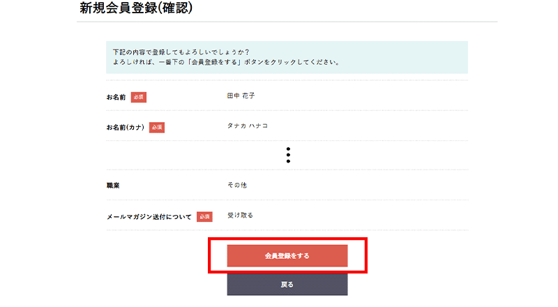 入力情報の内容をご確認ください。よろしければ、「会員登録をする」ボタンを押してください。※ご登録情報を修正する場合は、「戻る」から修正してください。