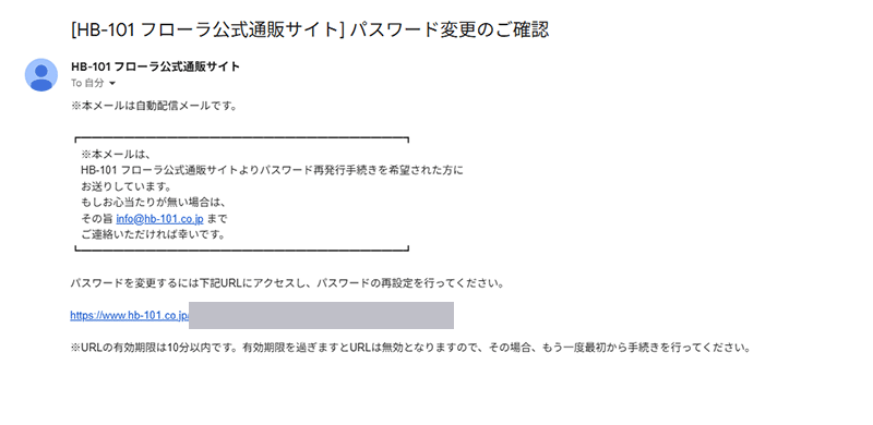 新規会員登録を行っていただきますと、ご指定のメールアドレスへ、「[HB-101 フローラ公式通販サイト] 会員登録が完了しました。」という件名のメールが「info-netshop@hb-101.co.jp」から届くようになっております。