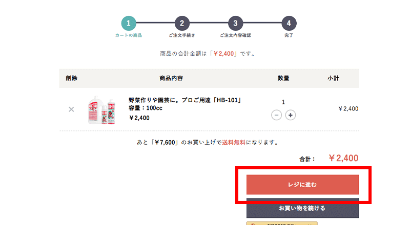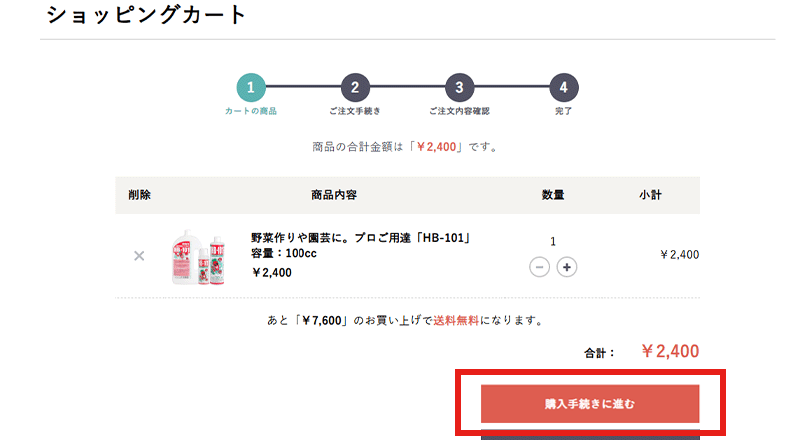 カート内の商品・数量・金額などをご確認のうえ、「ご注文手続きへ進む」ボタンをクリックしてください。