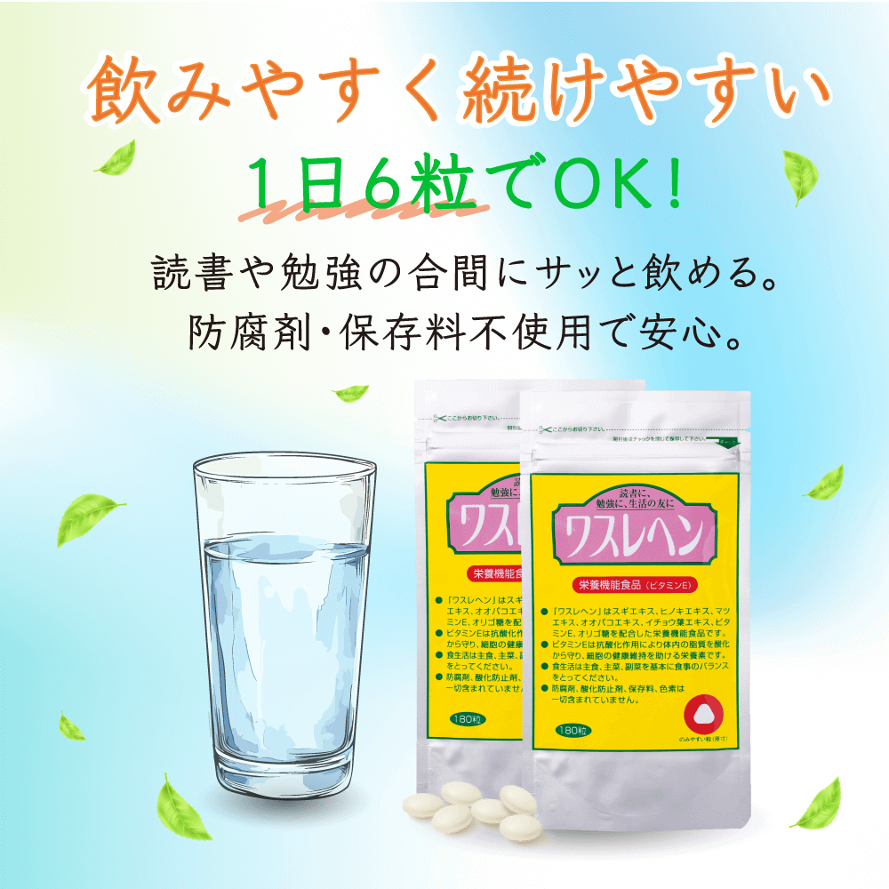 「ワスレヘン」を注文しましたが、最初は、ほんまかいな?と言う気持ちでした。しかし、ワスレヘンを飲み続けると、ことのほか不思議なくらいに記憶が冴えて、呑むと呑まないとで差がある事に気がつきました。娘が衛生管理の国家試験を取る為にワスレヘンを娘に勧めてみましたら、ワスレヘンを飲み続けたおかげで、娘は一発で合格しました。私も認知症の予防の為にワスレヘンを続けて行こうと思っております。ワスレヘンて、なんかおもろい名前やなあ。