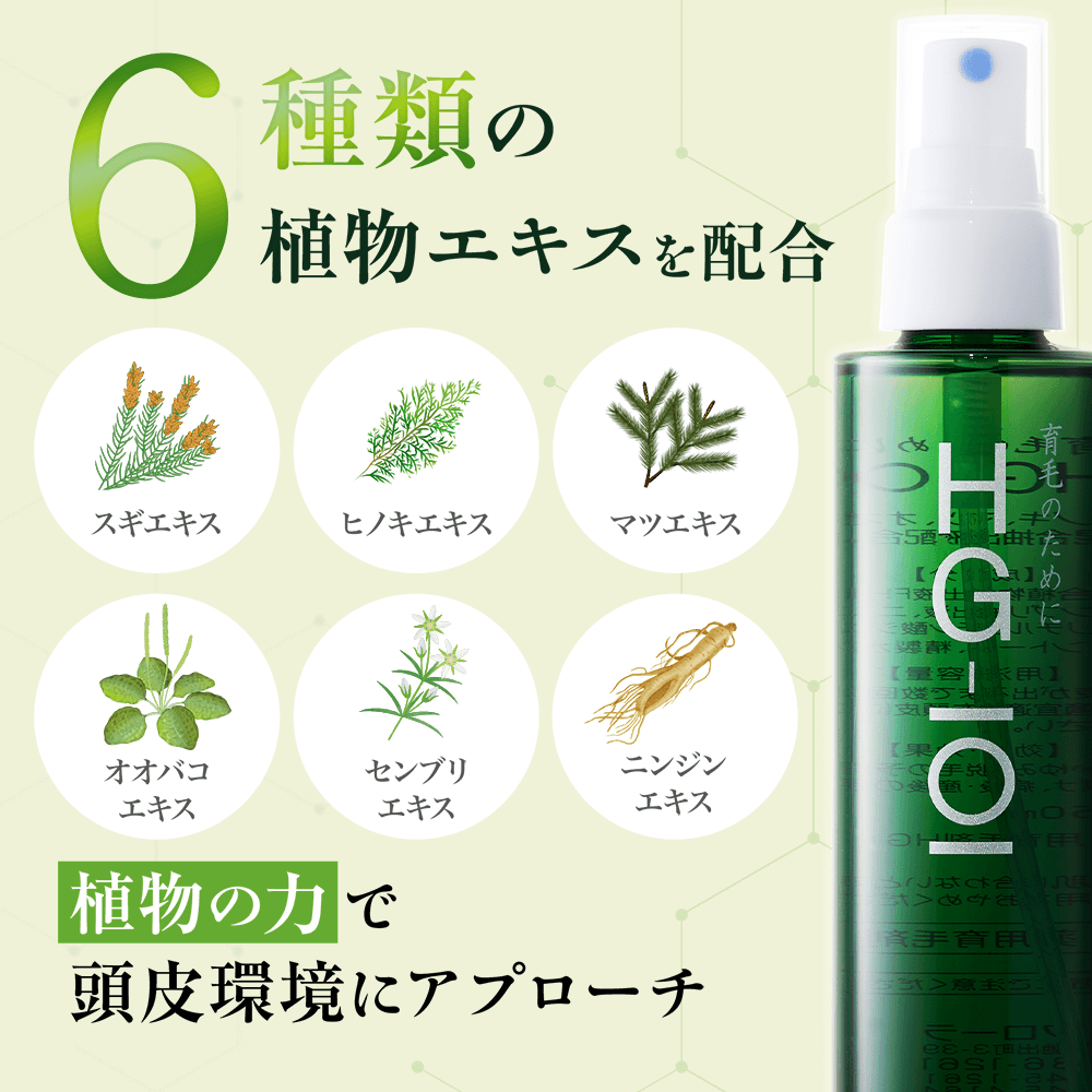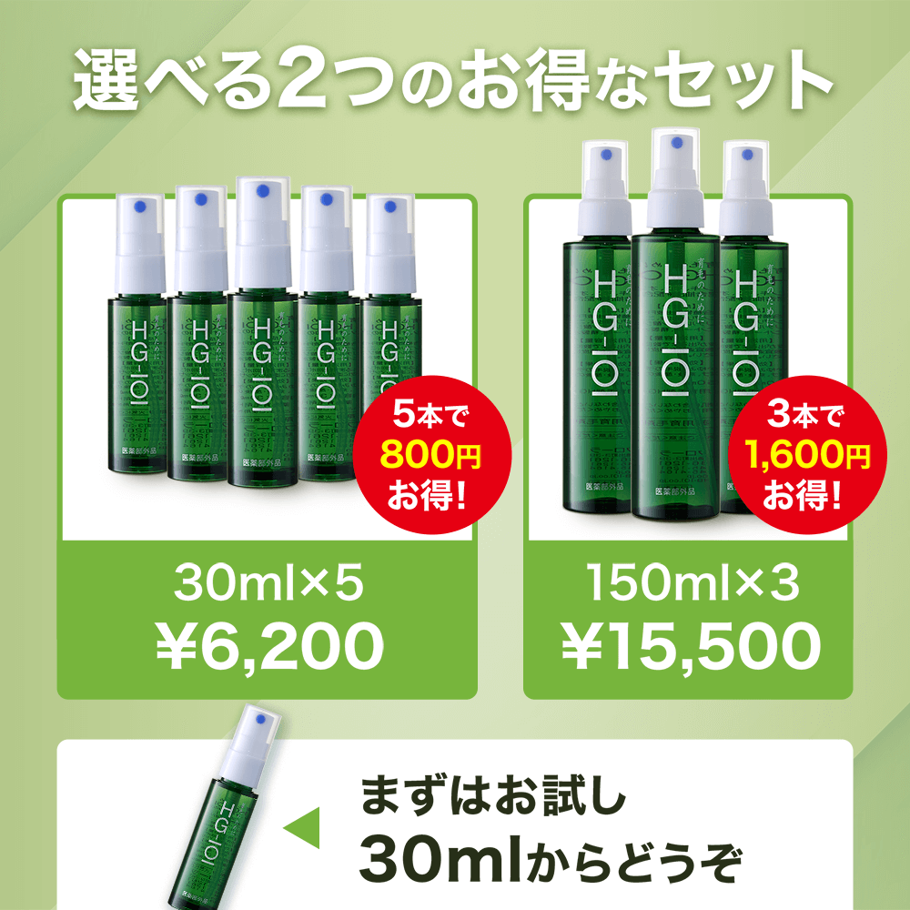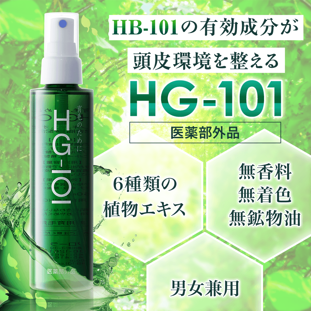 HG-101を使い始めたのは、ふけや抜け毛がひどくて困っていた頃でした。市販のシャンプーやリンスなどは刺激が強すぎるのか?とも思い、貴社の育毛剤HG-101を使いはじめたお陰で、脱け毛はなくなり、改善され、やはり、天然由来の成分で出来た育毛剤HG-101の効果かと思います。ありがとうございました。