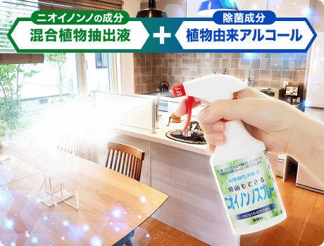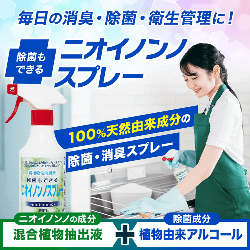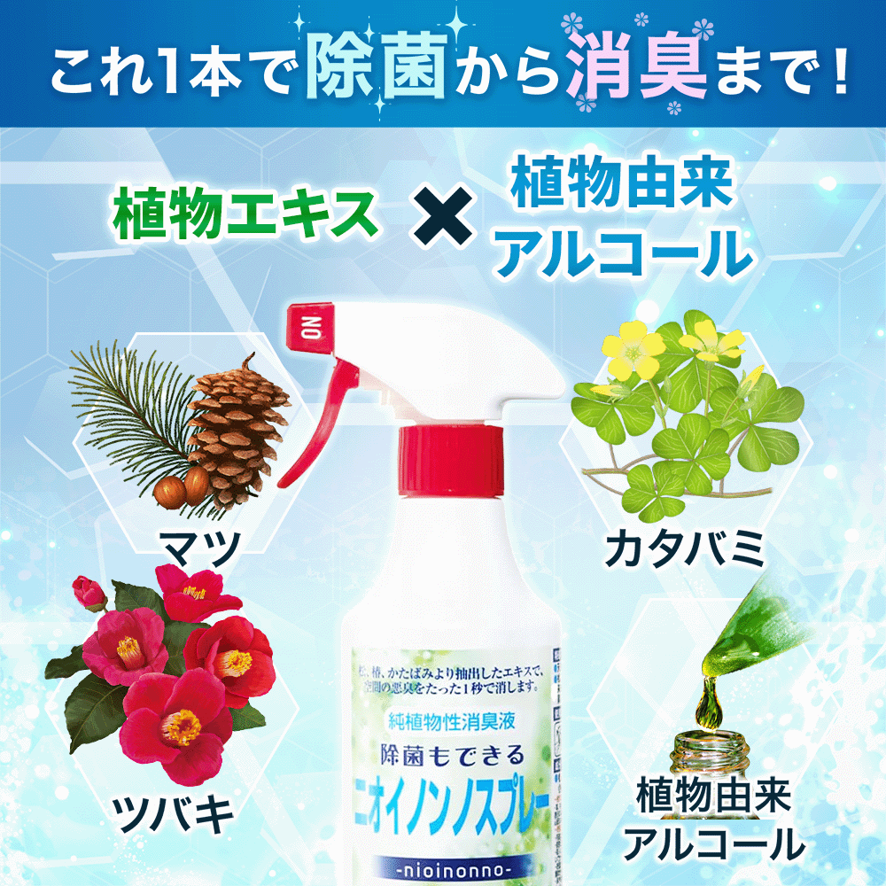 ニオイノンノの成分である松、椿、カタバミから抽出した100%天然植物エキスをベースに、植物由来アルコールを配合。これ1本で除菌から消臭までできるスプレーです。石油系の成分は一切含まず、安心・安全の植物成分でできております。