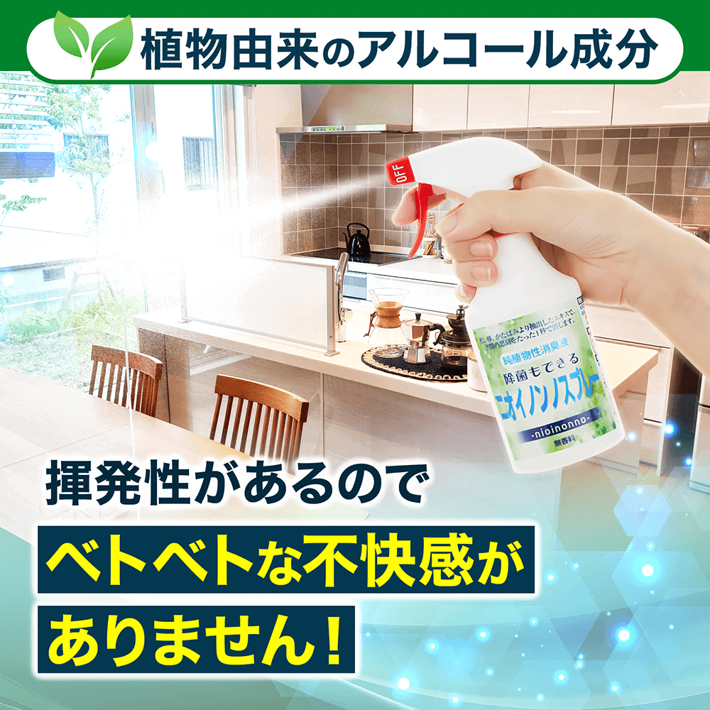 除菌もできるニオイノンノスプレーは植物由来のアルコール成分を配合しているため、使用後はサッと乾いてべたつきが残りません。