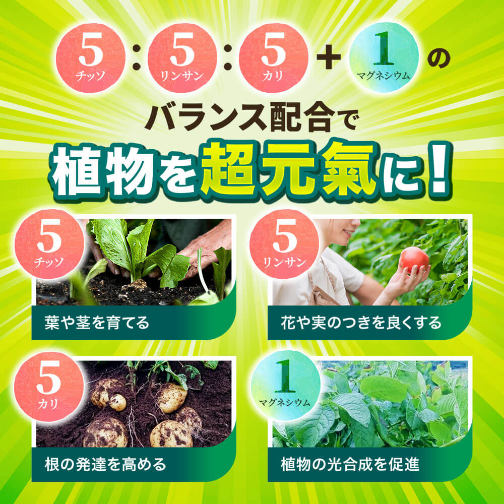 チッソ・リンサン・カリ・マグネシウムを5:5:5+1の比率で配合。健康で元気な植物に育てます。