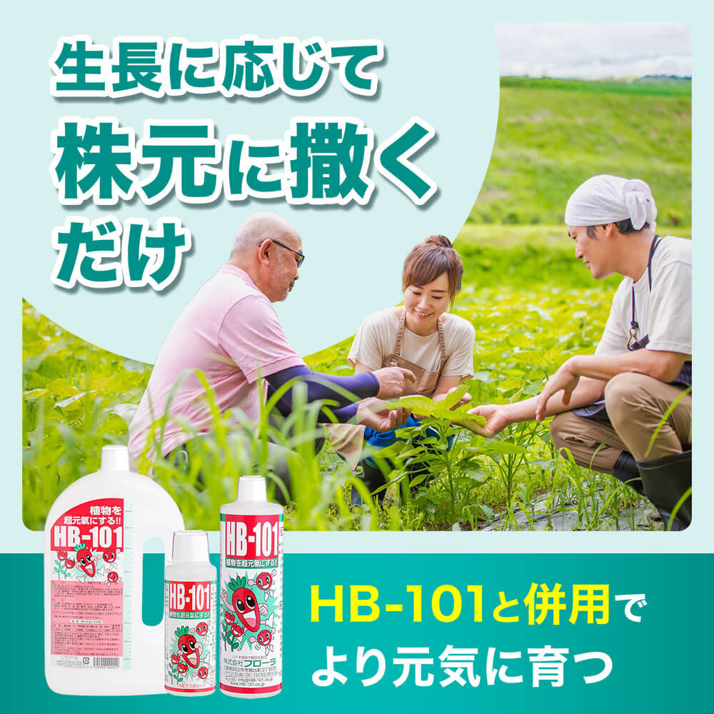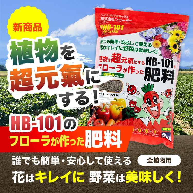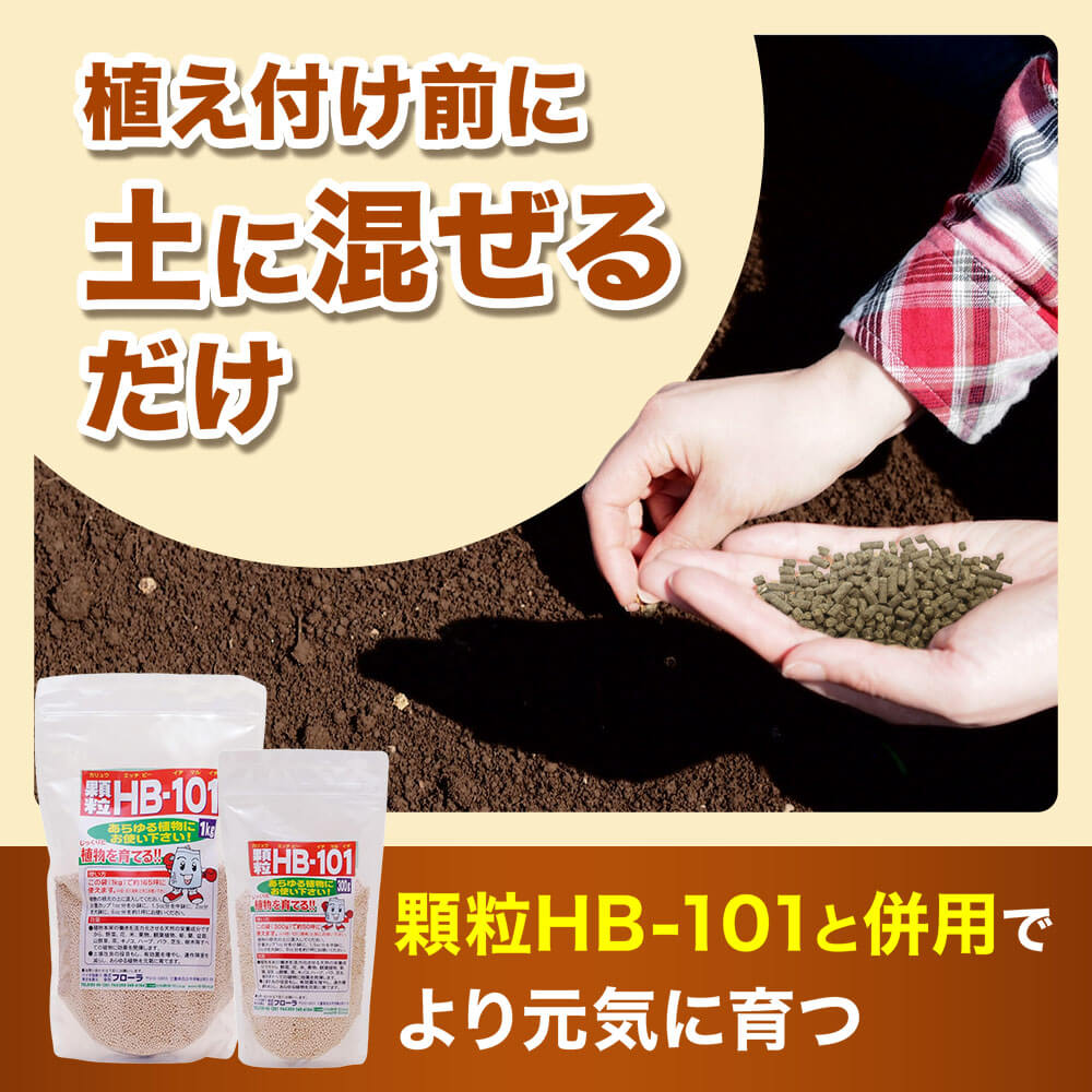 撒きやすいペレット状で、植え付け前の元肥や生長中の追肥にどちらにも対応。HB-101や顆粒HB-101と併用することで、さらに植物が元気に育ちます。