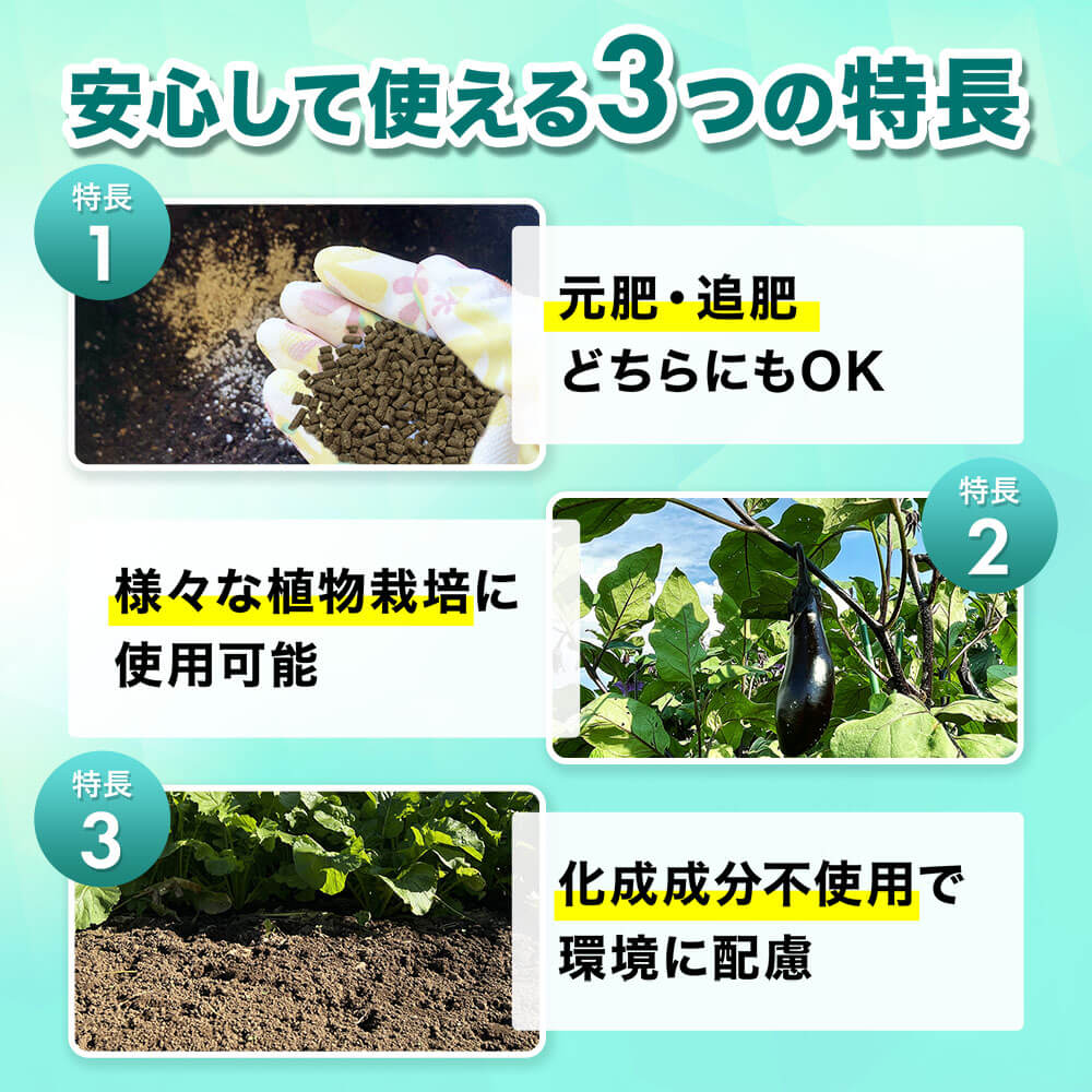 化成原料不使用で、国産天然原料を使用した肥料です。家庭菜園や花・野菜など、さまざまな植物に安心してお使いいただけます。